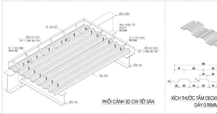 Gồm sàn deck h50w1000, đinh chống trượt, ke bo sàn deck, thanh chống ke, v.v...